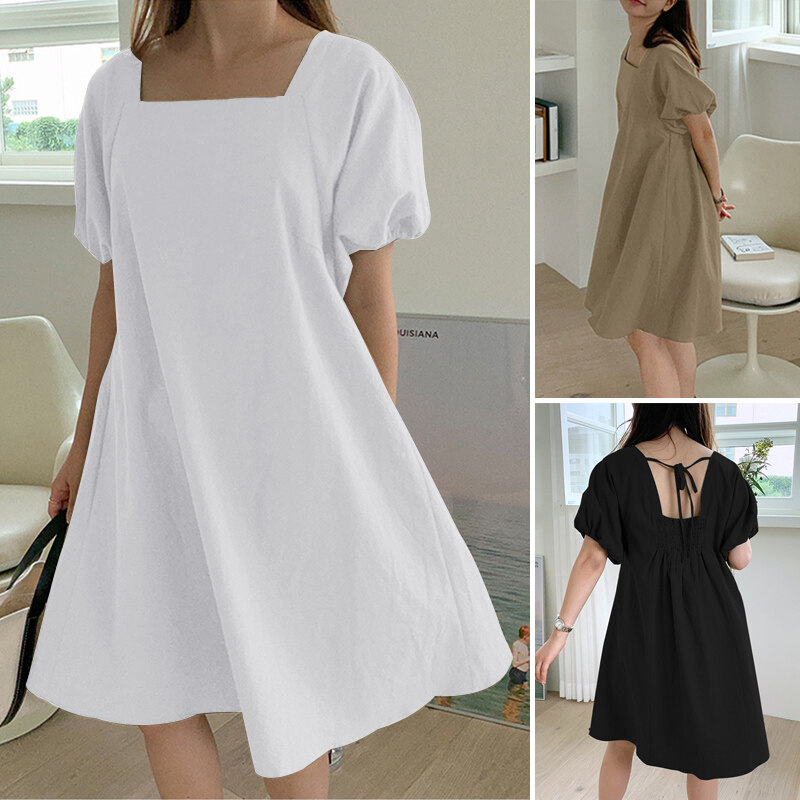 ZANZEA Korean Style Women Elastic Cuff Mini Dress Backless Tie Summer Solid Dress