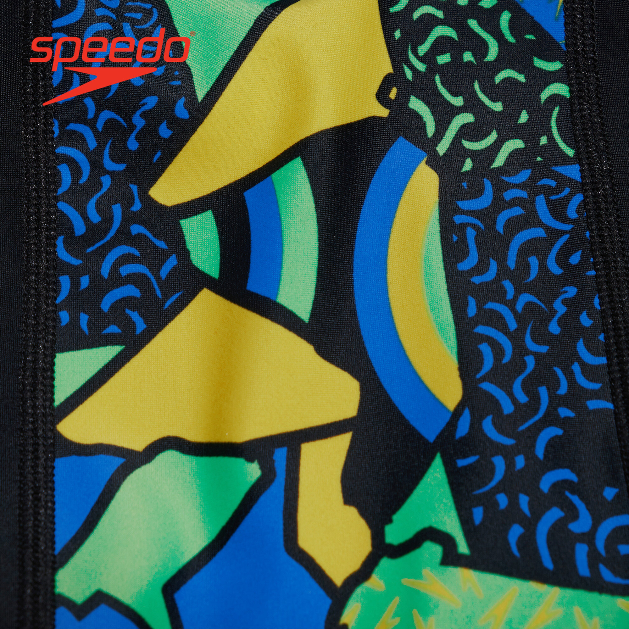 Style and comfort for lessons and training. Ooze confidence wearing this sleek black Jammer, which features side panels of our high-energy abstract print in bright yellow, green and blue. Lined at the front for comfort and modesty, the jammer includes an internal drawcord to allow your child to achieve a secure and comfortable fit. Providing higher chlorine resistance than standard swimwear fabrics, it offers excellent shape retention and fits like new for longer with CREORA® HighClo. If you’re looking for great eco-credentials, it’s got those, too: our exclusive Eco EnduraFlex fabric is made from 100% recycled pre-consumer waste, such as fabric waste from factories.